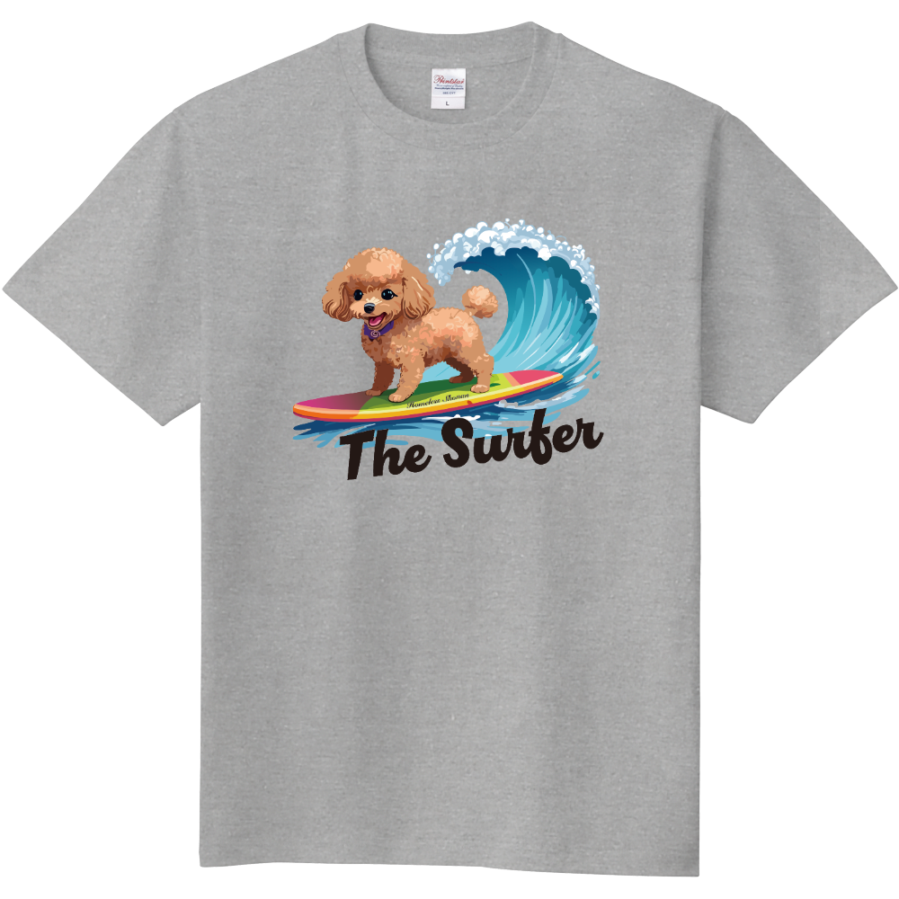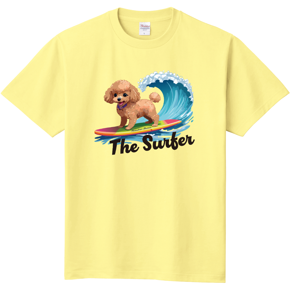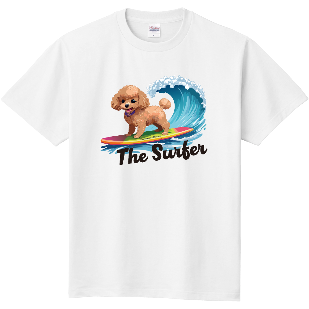 トイプードルがサーフィンを楽しむデザインのTシャツ。